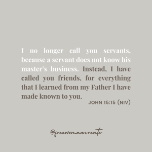 Join me in prayer: Jesus, thank You for calling me Your friend. May I not take Your friendship for granted. Please help me to intentionally spend quality time with You every day. May I release all burdens, access each blessing, and hear from You. In Your name, I pray. Amen.